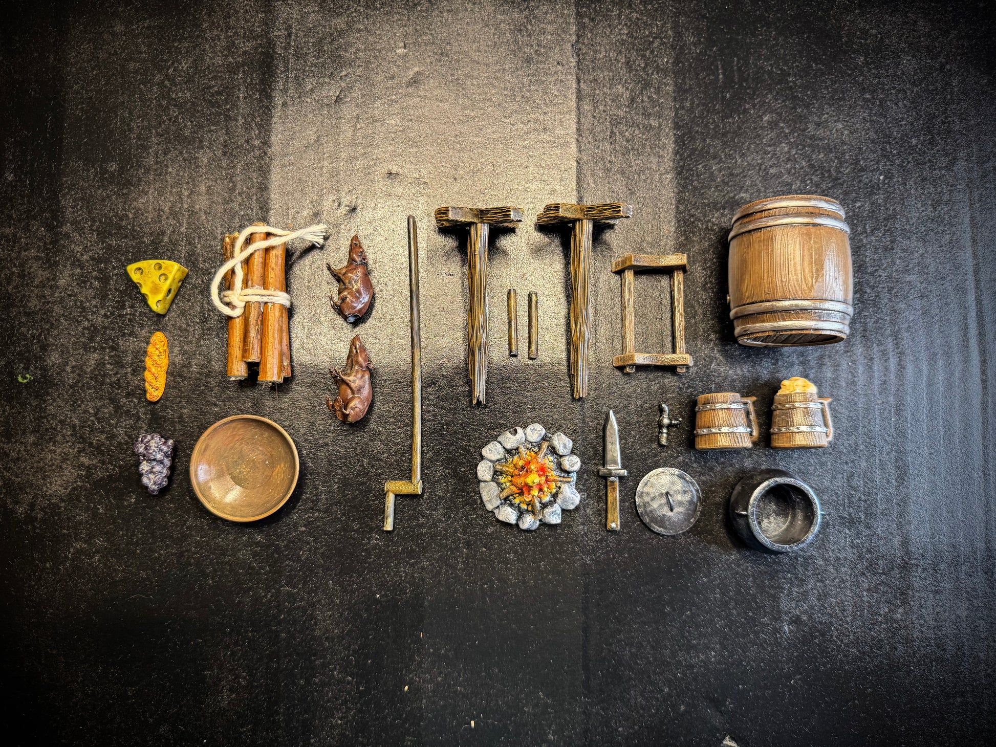 No journey is complete without a meal by the fire. The Hunter’s Campfire is a handcrafted accessory set designed for Mythic Legions or any 1:12 scale fantasy figures. With its rustic rotisserie setup, hearty food props, and camp essentials, this set adds gritty realism and adventure to your dioramas, photography, or displays.