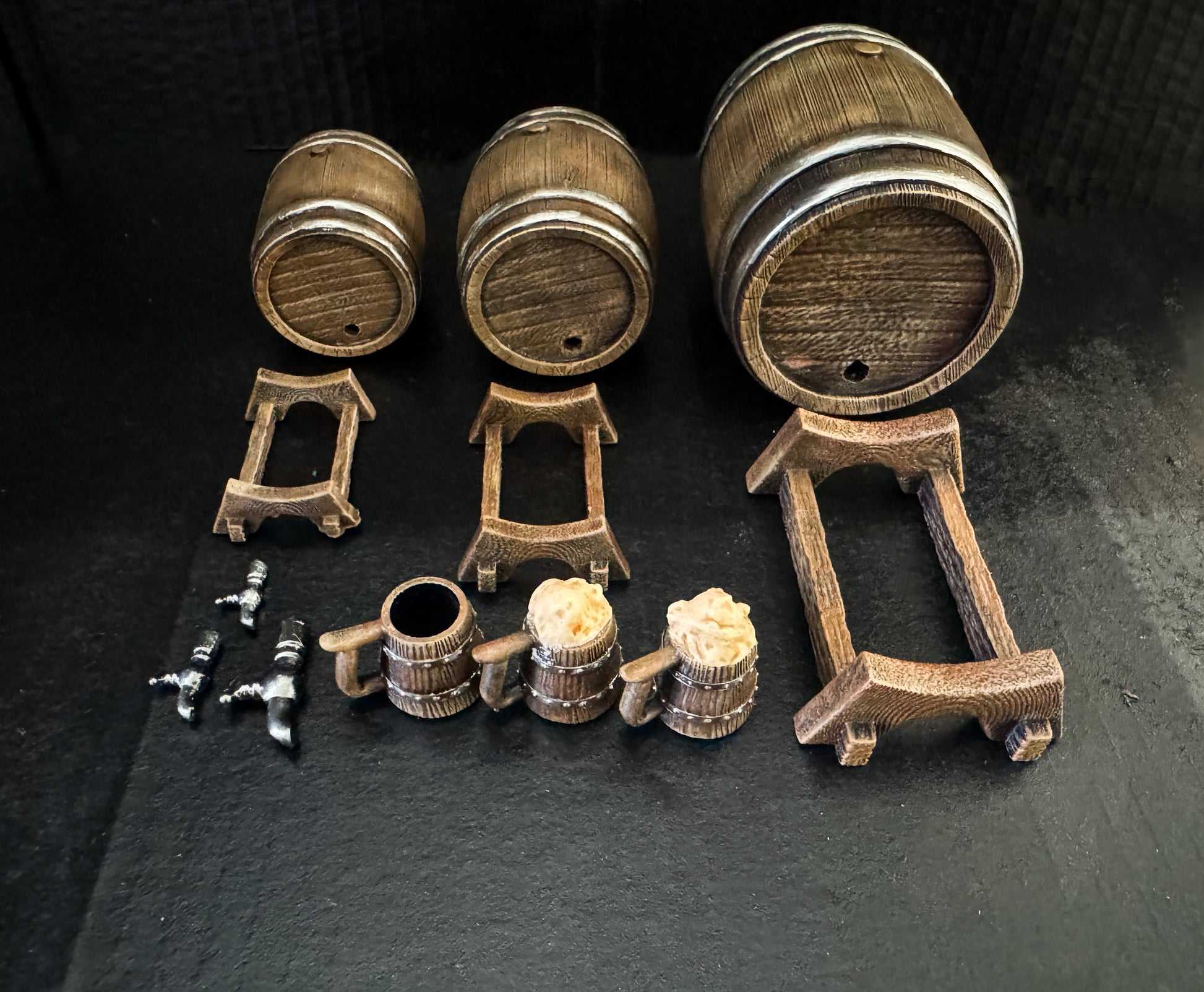 - Hand-Painted Details – Each barrel and mug is individually finished with realistic wood grain and metallic accents.